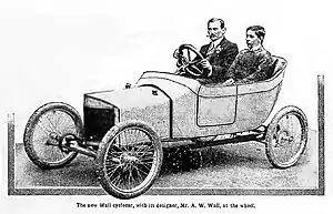 In 1912, Arthur Wall revealed his latest creation, a four-wheel cyclecar.[24] Two models were to be built with the same combination of engines as used on the Tricar. Unlike many cyclecars, the transmission was via propshaft with universal joint to a live rear axle. The twin has a two-speed (and reverse) Roc epicyclic gearbox (Roc Gear Co of Hay Mills, Birmingham was also an A. W. Walls company). A new company, Wall Cars Ltd of Tyselely, Birmingham had been created to produce the cars.