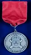 In 2001, the Artilleriregementets (A 9) förtjänstmedalj ("Artillery Regiment (A 9) Medal of Merit") in gold and silver (ArtregGM/SM) was established. The medal ribbon is of red moiré.[19]