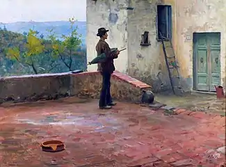 In 1881, with "La Trecciaiuola" (The Braiding), he began to approach the more natural style practiced by the Macchiaioli.[1] He exhibited the painting at the Salon in Paris, under the title "Paysanne d'Italie" (Italian Peasant Woman). Its success encouraged him to continue producing works on similar realistic themes and views of the Tuscan countryside.[2] In pursuit of inspiration, he moved his studio outside Florence. His first full exhibition in this new style came the following year, in Rome. In 1888, a similar exhibition in Bologna earned him the title of "Honorary Academician" at the Accademia di Belle Arti there.