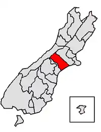 Ashburton District is a territorial authority district in the Canterbury Region of the South Island of New Zealand. It encompasses the town of Ashburton, a number of small towns and settlements and the surrounding rural area, roughly coterminous with Mid Canterbury. The district had a population of 36,800 as of June 2023.[2]