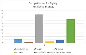 As the Bar chart shows, in 1881 the vast majority of males (44) in Ashleyhay were employed in Agriculture of some variety. The other four males eligible to work all had different occupations. One a Labourer, one involved in transport, one with an unspecified occupation and one with an unknown occupation. The majority of females (37) in Ashleyhay also had an unknown occupation, and 4 had an unspecified occupation, this doesn't necessarily mean they were unemployed but it is most likely the case especially with females. The only specified occupations that females had in 1881 were in Agriculture in which two females worked and in Domestic services in which six females worked.[8] The key reason for the majority of people working in an agricultural occupation is Ashleyhay's location. It is a very rural parish where the main resource is the land that can be used for farming .