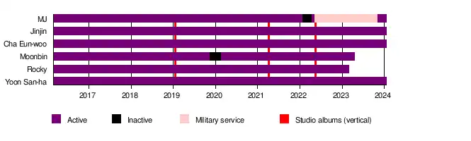 On February 28, 2023, it was announced that Rocky had ultimately decided to leave the agency and the group.[3][125] On April 20, Yonhap News reported that Moonbin had died the prior evening,[4] which was later confirmed by Astro's agency Fantagio.[126][127] The circumstances of his death are being investigated by the police.[4]