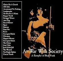 At War With Society[1] is an internationally distributed compilation album[2][3] mostly of artists that are on New Red Archives records. It was originally released in 1998[4] as a 33-song CD, but was then subsequently also released on CD with one less track. The album was compiled by New Red Archives. As of May 1999, it had reached sales of 77,000+ copies.[5] The second version[6] of the album (on New Red Archives/PHD Records) was issued with an alternate cover. The second version was compiled and released in 1999.