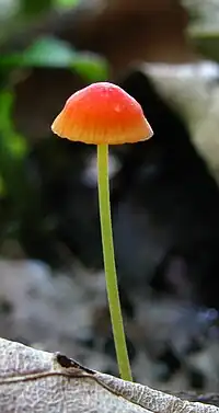 Atheniella adonis, which has the recommended name of scarlet bonnet in the UK,[1] is a species of agaric in the family Cyphellaceae. Found in Asia, Europe, and North America, it produces small orangish to reddish mushrooms with caps up to 1.2 cm (0.5 in) in diameter and thin pinkish-white stems reaching 4 cm (1.6 in) long. The fungus typically grows in conifer woods and peat bogs, suggesting a preference for acidic environments. The appearance of several atypical fruitings on deciduous wood in the Netherlands in the late 1970s was attributed to increases in atmospheric pollution that raised the acidity of the wood substrate.