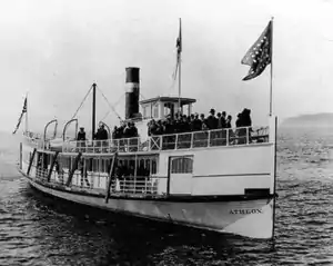 Once at Puget Sound, H.B. Kennedy put Athlon on the popular Seattle-Port Orchard (Navy Yard) Route, in competition with Joshua Green's boat, the Inland Flyer. Athlon's first captain on Puget Sound, in February 1901, was William Mitchell, who had worked his way up from cabin boy. (Mitchell eventually in 1933 became manager of the Kitsap Transportation Company, one of the last remaining competitors to the by-then dominant Puget Sound Navigation Company.)[2] By July 1901, H.B. Kennedy and Joshua Green reached a deal to end competition between their two boats, fixing rates on the route as was usual with these anti-competitive agreements. Over the years, the firms of H.B. Kennedy and Joshua Green's Puget Sound Navigation Company drew closer together and eventually merged. By 1903, Athlon was still owned by H.B. Kennedy personally, but was being operated by Puget Sound Navigation. This combination drove off all would be competitors including the Manette, and later, Arrow, even though Arrow was a much faster boat than Athlon, beating her by 30 minutes on a race from Seattle to Bremerton.[3]