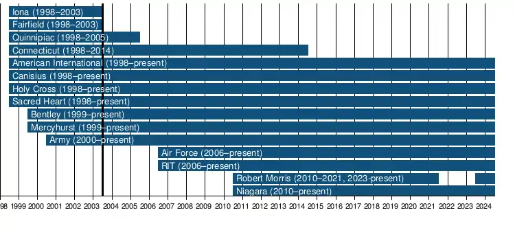 - ↑ Robert Morris was a member of Atlantic Hockey from 2010 to 2021 until the program was cut. Subsequent fundraising efforts allowed the program to be reinstated for the 2023–24 season with Robert Morris rejoining Atlantic Hockey.