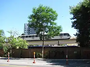 Electric power for lighting and braking is supplied to the train by a low voltage (50 V) current through the track the vehicles run on; this is used to charge onboard batteries. The trains have conventional brakes for accurate stopping at stations; these brakes are automatically applied if there is no pressure differential acting on the plate. Fully loaded vehicles have a ratio of payload to dead-weight of about 1:1, which is up to three times better than conventional alternatives.[34] The vehicles are driverless with motion determined by lineside controls.[35] Aeromovel was designed in the late 1970s by Brazilian Oskar H.W. Coester.[36]