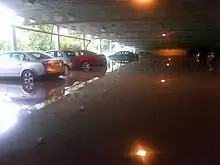 Daily rainfall records were broken in Detroit, Flint, and Saginaw, with Detroit recording its second-heaviest rainfall event on August 11, where 4.57 in (116 mm) of rain fell at Detroit Metropolitan Airport.[4][5][6] Vehicles were submerged on portions of Interstate 696 and Interstate 75.[6] In suburban portions of Detroit, peak rainfall amounts of 6.25 inches (159 mm) were recorded.[7] The American Automobile Association received over 700 calls for assistance in 12 hours, and heavy rainfall caused river levels to rise.[8] At Baker College near Allen Park, floods stranded 60 students and forced a portion of Interstate 94 to close.[9] Detroit Zoo closed as a result of flood damage there.[8] 32,000 power outages occurred during the flood event, and flood damage totaled $1.8 billion.[6][10]