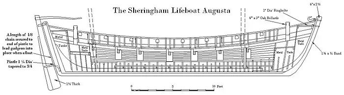 The new lifeboat was built by a local builder, Robert Sunman. It was made from timbers grown in the nearby Sherringham Park and the boat was built in the style of the local herring fishing boats. The Augusta was 33 feet 6 inches[3] long and 10-foot 3 inches[3] wide. The power for the boat was provide by 16 oars.[2] She was equipped with a dipping lug mainsail, mizzen sail and had fittings for a rudder at either end to avoid turning her in heavy seas.[3]
