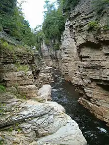 Ausable Chasm is a sandstone gorge and tourist attraction located near the hamlet of Keeseville, New York, United States.[1] It is directly due west of Port Kent. The Ausable River runs through it and then empties into Lake Champlain. The gorge is about two miles (3.2 km) long and is a tourist attraction in the Adirondacks region of Upstate New York. It is fed by the Rainbow Falls at its southern extreme.