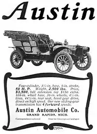 The Austin was a brass era American automobile manufactured in Grand Rapids, Michigan from 1901 to 1921. The company, founded by James E. Austin and his son Walter Austin, built large, expensive and powerful touring cars with an unusual double cantilever rear spring arrangement placing the rear wheels behind (sometimes well behind) the passenger compartment, for a longer wheelbase to improve rider comfort in an era of rough roads[1] as well as a unique two-speed rear axle.[2]
