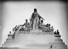 By 1909, the AMP Society found the current premises inadequate for its expanding business, and commissioned significant extensions to have six storeys above the street level and a full redesign of the existing premises on Pitt Street in a more restrained Free Classical style at a cost of £62,770.[10][11] The president of the NSW Institute of Architects, Ernest Alfred Scott of Scott & Green, was the architect, and Finlay Elgin Munro was the master builder.[10][12][13][14][15][16] The old 'Amicus' sculptural group by Charles Summers was determined to be too small in scale for the new offices and "fell to pieces" when it was removed, so the AMP Board commissioned a new 'Amicus' group sculpted by William Priestly MacIntosh to be placed atop the renewed headquarters.[17] The new offices were completed in late 1912, and were officially opened by the Governor of New South Wales, Lord Chelmsford, on 21 January 1913.[18]