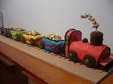 Because of the appealing decorative effects of the cakes, the book has garnered a nostalgic cult following including social media fan groups and projects to reproduce each cake.[8] In 2009, stand-up comedian Josh Earl included reference to the "train cake" in his routine. The segment was so popular he expanded it and the following year launched Josh Earl vs. the Australian Women's Weekly Children's Birthday Cake Book,[17] a show that continued through to 2015.[18] In 2016 all 107 cakes were baked and sold for a Canberra charity to raise money to support women with post- and ante-natal depression.[19][20] In 2018 New Zealand born photographer Henry Hargreaves created an exhibition in Wellington called "Birthdays that will never come" celebrating children who would never have birthdays in New Zealand, by combining children's names that are banned in New Zealand with the "very 80s aesthetic" of the cakes in the cookbook, familiar to him from childhood.[21]