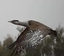 The largest male recorded was 14.5 kg (32 lb),[15] a specimen obtained in Victoria. Reports of large birds, presumably males, were given by Tom Carter in the west (16 lb), a recorded range of 16–18 lb by E. F. Boehm in South Australia was exceeded in some specimens (28 lb). The smaller specimens in records are of an unwell adult weighing 9 lb, shot by Carter at Broomehill, and a healthy but small specimen of 7½ lb captured and weighed by Dominic Serventy and Hubert Whittell at Bridgetown in 1949.[8] Although it is the largest extant flying land bird in Australia, this long-legged bird is the smallest species in the genus Ardeotis.[15]