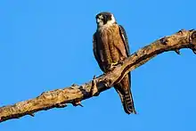 The Australian hobby has been recorded preying on avian species including the European starling (Sturnus vulgaris), house sparrow (Passer domesticus), crimson rosella (Platycercus elegans) and silvereye (Zosterops lateralis). Research suggests they tend to avoid large, dangerous, or agile species that forage close to cover, such as the common myna (Acridotheres tristis).[5] Insectivorous bats[2][10] and insects including beetles, cicadas, crickets and grasshoppers also form part of the hobby's diet.[11]