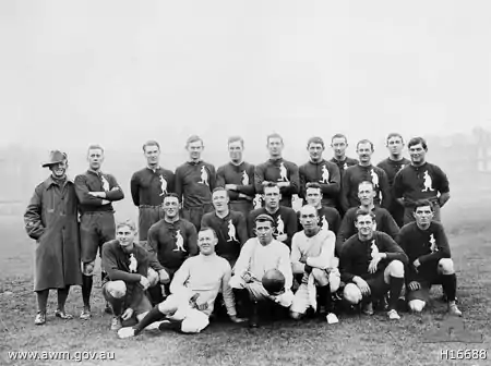 - ↑ A photograph of the mounted set that was sent to the Collingwood Football Club appears at Ross, (1996), p.89; Ross lists the source of the photograph as the Collingwood Football Club on p.370 (which is consistent with the mounted set being prepared, in part, for donation to each player's club). An almost identical pair of photographs, taken by the same photographer, at the same time (the fourth and the third players from the right in the back row also have their hands on the shoulders of the player seated at the right of the middle row), of the same men, are held by the Australian War Memorial (see Archived 28 September 2011 at the Wayback Machine and Archived 28 September 2011 at the Wayback Machine). Note that, on the evidence of the date on the mounting board (Ross, p.89), and the Times newspaper reports of 27 and 30 October 1916, and that in the text of Holmesby & Main, (1996, p.49), who had access to the news film — all of which place the match on Saturday 28 October 1916 — the date currently (viz., at 25 April 2008) given by the Australian War Memorial for the match (i.e., 2 November 1916) is mistaken.