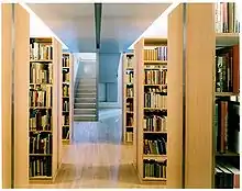 A competition was held in 1992 to choose a design for ACFNY's new building. Raimund Abraham was the winning architect among 226 submissions. Completed in 2002, the building is situated on a plot in Manhattan that is only 24.5 feet (7.5 m) wide[4] and 81 feet (25 m) deep.[5] It is considered as an architectural anomaly because, despite its small footprint, it is 24 stories and 275 feet (84 m) tall. The building's facade is clad in glass and aluminum and gradually tapers to a narrow point as it slants upwards in accordance with zoning laws.[5] It houses exhibition spaces, a theater, a library for books and audio recordings, offices, seminar and reception rooms, and apartments for the officers of the institution. The library is named in honor of Frederic Morton and has a collection of more than 10,000 books specific to Austrian art and culture.