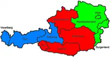 The Austrian Regionalliga (German: Regionalliga or plural Regionalligen, means Regional League) is the third-highest division in Austrian football, after the Austrian Bundesliga and the Second League. It is divided into 3 groups: East (Ost), covering the states of Vienna, Lower Austria and Burgenland; Central (Mitte), covering the states of Styria, Carinthia, Upper Austria and the exclave of East Tyrol; West (West), covering the state of Salzburg; Regionalliga Tirol, covering the state of Tyrol (with the exception of East Tyrol) and the Eliteliga Vorarlberg, covering the state of Vorarlberg.
