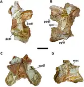 Several traits show that Austroposeidon was a titanosaur; the hyposphene-hypantrum articulations are missing from the vertebrae, the cervical and dorsal vertebrae do not have forked neural spines, and the internal texture of the bone is camellate (punctuated by many small air chambers). The describers determined that Austroposeidon was a new genus based on a number of autapomorphies (traits unique to the known fossils) in the vertebrae: the thirteenth cervical vertebra has columnar centropostzygapophyseal laminae, and its rear centrodiapophyseal lamina splits into two prongs; the first dorsal vertebra has front and back centrodiapophyseal laminae that curve downwards and outwards, and its diapophysis stretches down to the top margin of the centrum; and the frontmost part of the spinoprezygapophyseal laminae forks in the dorsal vertebrae positioned towards the back of the torso. Additionally, Austroposeidon possesses a unique combination of other vertebral traits, not seen elsewhere among titanosaurs.[1]