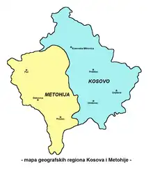 The Autonomous Province of Kosovo and Metohija (Serbian: Косово и Метохиja, romanized: Kosovo i Metohija; Albanian: Kosova dhe Metohia), commonly known as Kosovo and abbreviated to Kosmet or KiM, is an autonomous province defined by the Constitution of Serbia that occupies the southernmost part of Serbia. The territory is the subject of an ongoing political and territorial dispute between Republic of Serbia and the partially recognised Republic of Kosovo, the latter of which has control over the territory. Its claimed administrative capital and largest city is Pristina.