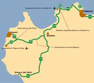 The Autostrada A29 is a 114.8 km (71.3 mi) motorway on the island of Sicily that links Palermo to Mazara del Vallo. The motorway is also called Autostrada del Sale (Motorway of Salt) because one of its branches ends at the Salt Pans between Marsala and Trapani. It's a four-lane motorway in its whole length.