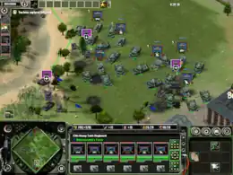 "Regiments" are the base combat groups that the player can control.[15] A regiment is composed of a certain squad of units, where a unit can be, for example, an Anti-Tank Infantry, a Halftrack, or a Light Tank.[1] The player controls the entire regiment as a whole, but cannot select and control its individual units.[19][14][15] Every unit within a regiment is different, for example, a tank destroyer will paralyze units while mortar units will splash bombard.[20][21] A regiment can be toggled into three states of unit formation, which trade the regiment's movement speed for attack efficiency, meaning hit-and-run attacks are less damaging than slow advances.[1][14] There is also a feature called "entrenchment" in which a regiment gains a large defensive bonus if idle for a certain period of time.[1] Furthermore, regiments gain experience from battles and have four tiers of veterancy, which improve the attack and defense of the regiment's units with each level.[1][14]