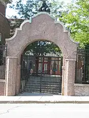 Palmer started to build a garden along the north side of the house in 1924 that he called A Little Bit O’ Heaven. It was largely a collection of artwork and artifacts that Palmer and his wife, Mabel Heath Palmer, collected on their trips to Asia and Europe. Part of the collection was also kept on the porch. A courtyard contained items such as totem poles, statues of deer, birds and the birth of Venus. There was a rock-lined corridor called “purgatory” that led to the heart of the exhibit that contained a large greenhouse with a waterfall of 40 feet (12 m) and a pond that was filled with tropical fish, alligators and Oriental art.[6] The site also contained what Palmer claimed was the smallest chapel in the world, it was 8 square feet (0.74 m2), and thousands of people wed there.[7] For a small fee the public was allowed to visit the site. It was one of the most popular attractions in Davenport.[7] After Palmer's death in 1961 A Little Bit O’ Heaven started to decline and it was closed to the public in 1981 and it was dismantled in 1983.