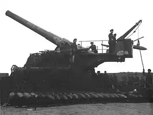 The custom-designed 35-calibres Mk XIII gun had a heavier breech which allowed the trunnions to be closer to the breech and hence the breech did not depress as far when the barrel was elevated. On a new Mk IV mounting, Mk XIII guns could then be elevated to 40° and attain a range of 22,600 yards.[4] These remained in service until 1945, serving in the home defence of Britain in World War II where they were deployed on railways in the south and east of Britain, along with 12" rail howitzers. Their main role in WW2 was to bombard any hostile landing, and potentially any captured airfields. Live firing produced a significant recoil and so rail spurs were laid specifically for the rail guns which incorporated ground anchors, and allowed firing in the general direction of the track. The blast wave from the guns could damage civilian infrastructure so the rail spurs were generally in unpopulated areas.