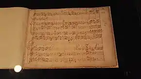 F-Sn Ms 2.965 and D-B Mus. ms. Bach St 131 are manuscript copies of the concerto realised during the composer's lifetime, in 1721 and around the 1730s respectively, after the autographs of the final version.[15][16] In his Triple Concerto, BWV 1044, Bach returned to the format of the fifth Brandenburg Concerto. A handful extant copies of the fifth Brandenburg Concerto were produced in the second half of the 18th century.[17] In this period Bach's autograph score and performance parts of BWV 1050 were owned by Johann Kirnberger and the composer's son Carl Philipp Emanuel respectively: by the middle of the 19th century both manuscripts were in the possession of the Berlin State Library, the former via Kirnberger's pupil Princess Anna Amalia of Prussia and the Joachimsthal Gymnasium, and the latter via Georg Poelchau.[12][11][18]