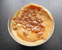 Baba de camelo (literally camel slobber) is a typical Portuguese dessert made with condensed milk and eggs with almond or cookie toppings.[1][2]