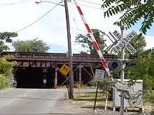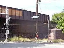 The West Shore Railroad, the Erie Railroad's Northern Branch, and the New York, Susquehanna, and Western (NYSW) all passed through the area running parallel to each other.[8] Both Erie and NYSW maintained minor stations[9] nearby 83rd Street, which crossed under the right-of-way of the West Shore. Granton Junction was located just south of the stations and was where NYSW and Erie converged after the latter had also passed under the West Shore.[10][11] For a time Granton was busy railroad junction used by both the Erie and NYSW, which shared track and stations, including the Susquehanna Transfer. The name Granton comes from a former quarry that later was the site of an important fossil find of a phytosaur.[12] Joint operations between the Erie and NYSW were controlled by GR Tower, which in 1959 was destroyed by fire, ending the relationship.[13] Originally the soap works were outfitted with rail spurs by the NYSW, but the soap company shifted more and more of its traffic to trucks, and in 1909 (apparently in retaliation for the loss of business), anonymous agents of the railroad removed the spur after temporarily imprisoning the factory's workers in a boxcar to prevent any interference.[14] In August 1922, a full Sunday evening Erie train heading south to Pavonia Terminal was struck by bombs thrown at it in what was considered an act of sabotage and an attempt to cause a collision.[15][16]