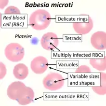 - 1 2 3 Hunfeld KP, Hildebrandt A, Gray JS (2008). "Babesiosis: Recent insights into an ancient disease". Int J Parasitol. 38 (11): 1219–37. doi:10.1016/j.ijpara.2008.03.001. PMID 18440005.