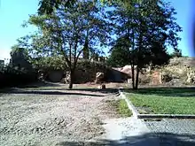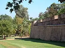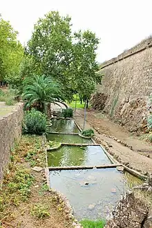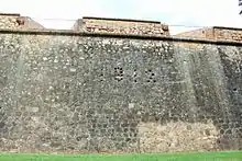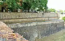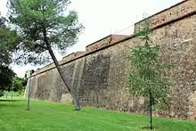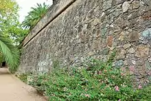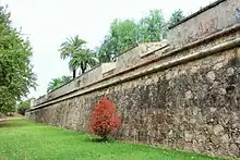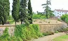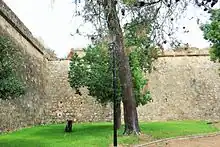 - Curtain wall of the bastion, old defensive walls and, in the middle, the moat