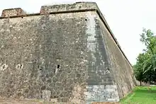 It has the number 2 in the Plan of bastions. It is located next to the "Semi-bastion of San Antonio" and before the one of Trinidad, in the eastern zone of the bastioned enclosure, in front of the Rivillas river. Between these two bastions is the Merida Gate. Its construction dates from the last decades of the 17th century, the same period as that of the bastion of Trinidad, making both the oldest bastions in the enclosure.[16] It had a series of bartizan of which only their bases remain, as well as embrasures at the top of the defensive wall, but at present there are no remains of them. In 1772 the right flank of the bastion was provided with a series of arrowslits connected by a gallery for the circulation of the riflemen. The interior zone is very deteriorated.[20]