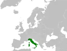 In spite of the name, this species is native to Italy (where it is present on all territories except for the extreme north-east, south-east and south-west) and Corsica.[1] It was probably introduced to the Balearic Islands in prehistoric times,[2] where it is common but declining.[1] Its formerly extended into Switzerland and there have been (so far) unsuccessful reintroduction attempts in that country.[3] Its range meets that of the similar and closely related European green toad (B. viridis) in far northeastern Italy and that of the Sicilian green toad (B. boulengeri siculus) in easternmost Sicily.[3][4]
