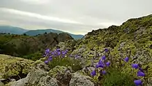Montane ecosystems are diverse and include several plant communities: forests, shrubs, meadows, pastures and peatlands. There are six different vegetation zone in the park. Oak, beech, spruce, subalpine zone of the shrub vegetation of common horsetail, blueberry, subalpine spruce and mugo pine. Other plants include shrub alder, steppe pedunculate oak, but also rare and endangered species like European pasqueflower, yellow pheasant's eye, Kosovo peony, common sundew, Heldreich's maple, martagon lily, pygmy iris and marsh orchid.[40] In total, there are 1,190 plant species, including a locally endemic winged bellflower (Campanula calyciliata) and Pančić's frog grass (Senecio pancicii), which can be found only on the mountain. There are also communities of mountainous sphagnum bogs on the localities of Jabučko Ravnište, Babin Zub and Arbinje.[39] Some 350 herb species are considered medicinal or aromatic. In 2022, several independent surveys from various universities and institutes were conducted, in order to list all of them, to enhance their protection, and to check possibilities for potential plantation production. Vast areas south and southeast from the mountain are already transformed into the aromatic herbs plantations, especially the entire slopes of the nearby mountains being planted with lavender.[42]