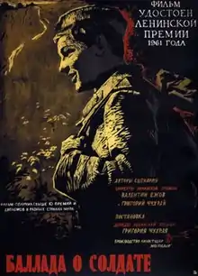 Ballad of a Soldier (Russian: Баллада о солдате, Ballada o soldate), is a 1959 Soviet film directed by Grigory Chukhray and starring Vladimir Ivashov and Zhanna Prokhorenko.[2] While set during World War II, Ballad of a Soldier is not primarily a war film. It recounts, within the context of the turmoil of war, various kinds of love: the romantic love of a young couple, the committed love of a married couple, and a mother's love of her child, as a Red Army soldier tries to make it home during a leave, meeting several civilians on his way and falling in love. The film was produced at Mosfilm and won several awards, including the BAFTA Award for Best Film From Any Source and was nominated for an Academy Award for Best Original Screenplay.
