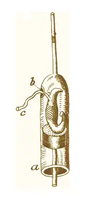 In 1667, Jan Swammerdam, a Dutch anatomist famous for working with insects, struck the first important blow against the balloonist theory. Swammerdam, who was the first to experiment on nerve-muscle preparations, showed that muscles do not increase in size when they contract (and he supposed if a substance such as animal spirits flowed into muscles, their volume should increase when they contract). Swammerdam placed severed frog thigh muscle in an airtight syringe with a small amount of water in the tip.[3] He could thus determine whether there was a change the volume of the muscle when it contracted by observing a change in the level of the water (image at right).[3] When Swammerdam caused the muscle to contract by irritating the nerve, the water level did not rise but rather was lowered by a minute amount; this showed that no air or fluid could be flowing into the muscle.[3] Swammerdam did not believe the results of his own experiment, suggesting that they were the result of artifact.[3] However, he concluded in his book The Book of Nature II that "motion or irritation of the nerve alone is necessary to produce muscular motion".[3] This idea was an important step toward the current understanding of how nerves actually cause muscle contraction.[3]