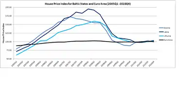 The Baltic states' housing bubble was an economic bubble involving major cities in Estonia, Latvia and Lithuania. The three Baltic countries had enjoyed a relatively strong economic growth between 2000 and 2006, and the real estate sectors had performed well since 2000. In fact, in between 2005Q1 and 2007Q1, the official house price index for Estonia, Latvia and Lithuania recorded a sharp jump of 104.6%, 134.3% and 106.7%. By comparison, the official house price index for Euro Area increased by 11.8% for a similar time period.[1]
