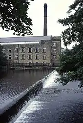 As for so many Peak District villages, it developed around its mill, which existed here before the Industrial Revolution. From 1782, a water powered corn mill was built here by a local farmer and miller, Christopher Kirk. This only lasted a few years until destroyed by fire in 1791. It was rebuilt as a cotton mill, still powered by water. In the early 19th century it converted to steam power, with a 60 horsepower (45 kW) beam engine.[10] A more modern horizontal cross-compound mill engine with a rope drive, Edna, by Musgrave was installed in 1907, and remains on site today. Water power was still used for generating electricity for this isolated mill, with two reaction turbines of 45 hp (34 kW) and 22 hp (16 kW). Until 1951 the mill also maintained its own gasworks.[10] More electricity generating capacity was provided by a DC generator driven by a De Laval impulse turbine and reduction gearbox, built by Greenwood & Batley.