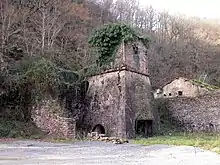[21] These remains are at the northern entrance of the village including a blast furnace. The supply canal is fed by the waters of the Nive captured upstream and turn a wheel of a blower machine which injected air at the base of the blast furnace through two nozzles. The adjacent building, still dominated by the canal, housed the forge fires and hammers to make cast iron and a splitting mill for splitting iron bars.