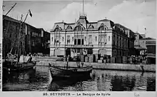 The Ottoman Bank opened a branch in Beirut immediately after its creation in 1856. It was reorganized in 1863 as the Imperial Ottoman Bank, known by its French acronym BIO for Banque Impériale Ottomane. In the 1890s, the BIO was instrumental in developing the Port of Beirut and the Beirut-Damascus railway and extensions in Syria.[2] The branch was initially located inside Khan Antoun Bey in the Beirut Souks; in 1892 it moved to a new building on place des canons, now Martyrs' Square; and in 1906 to another new building in Western architectural style on the waterfront at the northern end of the street later named Allenby Street, while the previous location was repurposed as the Khedivial Hotel.[3] The former two venues were destroyed during the Lebanese Civil War and not rebuilt during postwar reconstruction, while the latter was replaced before the war by the high-rise office building known as One Allenby Street.