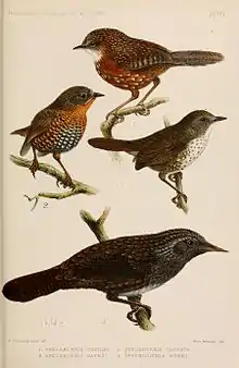 The bar-winged wren-babbler (Spelaeornis troglodytoides) is a species of bird in the family Timaliidae. It is found in Bhutan, China, India, and Myanmar. Its natural habitat is subtropical or tropical moist montane forest.[1]