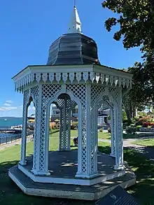 To the west of the inn, on the slope leading up to Agamont Park, stands a gazebo. It is an authentic recreation of an original design built by Calvin Ryder in 1840 on the "White House" lawn in Belfast, Maine. That construction was listed on the National Historic Register, and was the only one of its kind until 1985, when a replica was built by Francis Cormier of Deer Isle, Maine. In May 1991, Cormier built and erected the Bar Harbor Inn gazebo. Its boards are made from Douglas fir; its floor is made from western red cedar; it contains 100 pounds of lead in its corners; brass pins to fasten the lead; stainless steel nails; vertical grain Douglas fir for the roof and gold leaf for the top. Its roof contains eight condos for the local birds. Each unit was designed with a slight tilt in the floor so that rain water will run out the hole under the bird-house stoop.[11]