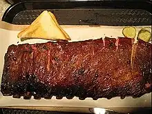 The first ingredient in the barbecue tradition is the meat. The most widely used meat in most barbecue is pork, particularly pork ribs, and also the pork shoulder for pulled pork.[4] In Texas, beef is more common, especially brisket.