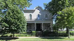 The Kelley House is a brick building with a stone foundation, an asphalt roof, and various additional elements of stone.[3] Designed and built by L.C. and B.C. Coffman and by Amos Cooke,[1] it is one of several Italianate houses in the city, but none of the others feature the Kelley House's most prominent component. Some of its typical Italianate features include the ornamental frieze, the cornice supported by pairs of brackets, the keystones and architraves on the rounded arched windows, and the quoins. Setting the house apart from the other Italianate residences is its unusual circular front dormer window,[2]: 410 set in a semicircular extension of the facade. The side of the house is divided into two bays and the front into three, with the main entrance in the middle; a porch is placed across the full width of the facade.[3] Washington Court House is not the only city in the region in which circular dormer windows are rare; the Doan House is the only such residence with such a window in Wilmington to the southeast.[2]: 149
