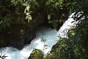 The best known spring is at the very beginning of the river, called La Rodilla del Diablo ("The Devil’s Knee"), after a small indentation in the rock next to the pool formed by the spring. According to local myth, the indentation was formed by the Devil falling to his knees, but there are competing versions as to why he did. The first states that he was forced to his knees by a crucifix held by Juan de San Miguel, the Franciscan friar who founded modern Uruapan.[6][7] Another version of the story states that the impression was made by the knee when the Devil tripped and fell fleeing from the same person.[5][6]