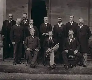 ![]() Governor-General Lord Hopetoun with first arrangement of newly appointed ministers to the Barton ministry on 1 January 1901. Sir James Dickson (fifth standing to the left) would be dead nine days later. | |