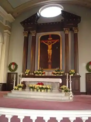 The church basement has a number of artifacts associated with the history of the Roman Catholic Archdiocese of Saint Louis, including a bell given to the church by the governor of the territory of Louisiana during the early 19th century.[21] Bishop Joseph Rosati, who ordered the construction of the church, is interred in a vault underneath the sanctuary.