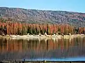 In addition to beetle infestations, Bass Lake has been affected by drought and numerous record-setting wildfires in the decade from 2011 to 2020. This combination of factors, including fire, drought, and bark beetle infestations linked to the drought, has resulted in a substantial loss of ponderosa pine forest. The Courtney Fire in 2014 was particularly devastating, leading to the loss of most trees within the 80-acre fire perimeter, stretching from Bass Lake Heights to the lake shore.[24]
